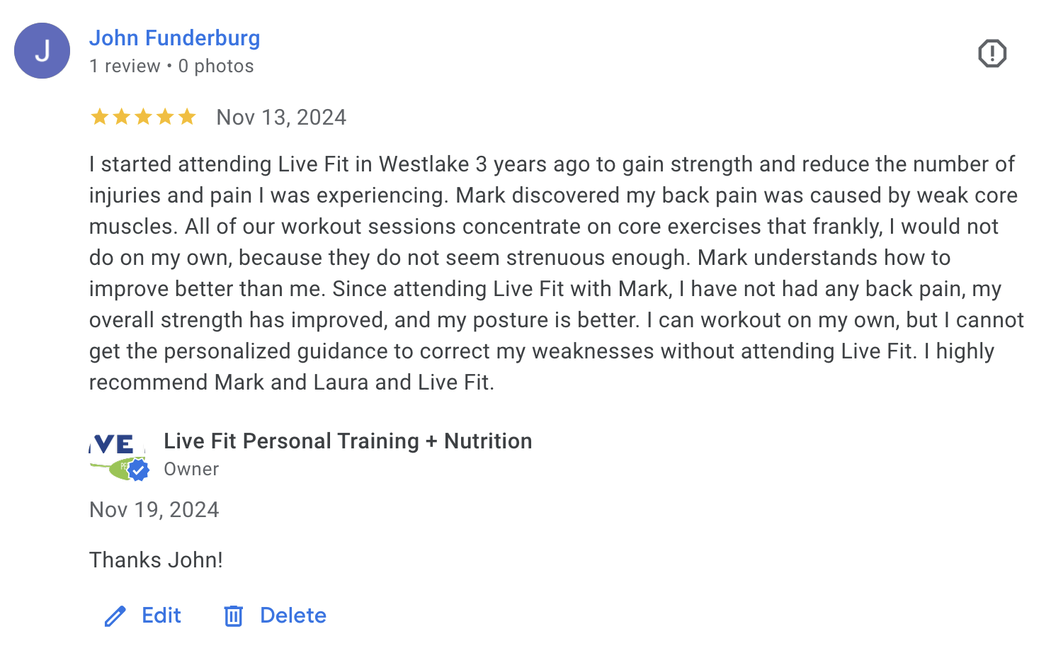 Live Fit is consistently rated as one of the top personal training studios in Northeast Ohio. We are a recipient of the Angie's List Super Service award (multiple times), have a perfect 5-star rating on Google, and won the Thumbtack Best Of Award (multiple times). We invite you to check out our outstanding ratings for yourself.